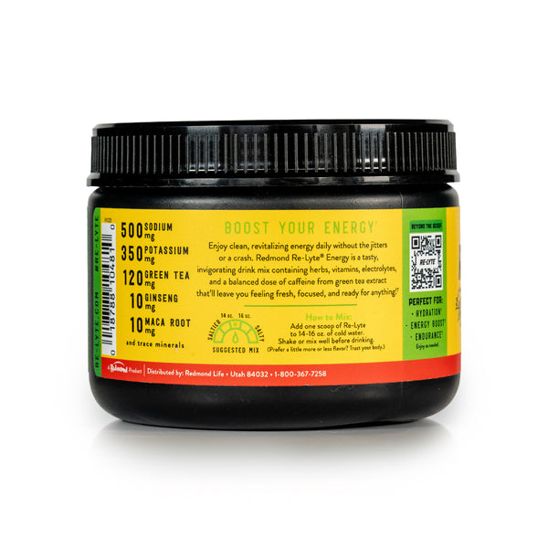 Enjoy clean, revitalizing energy with Redmond Re-Lyte Energy. Through a blend of herbs, vitamins, electrolytes, and a balanced dose of caffeine from green tea extract, this refreshing drink mix is intentionally formulated to fuel natural energy while minimizing the chance of jitters or a crash. Drink it daily to feel fresh, focused, and ready for anything! -