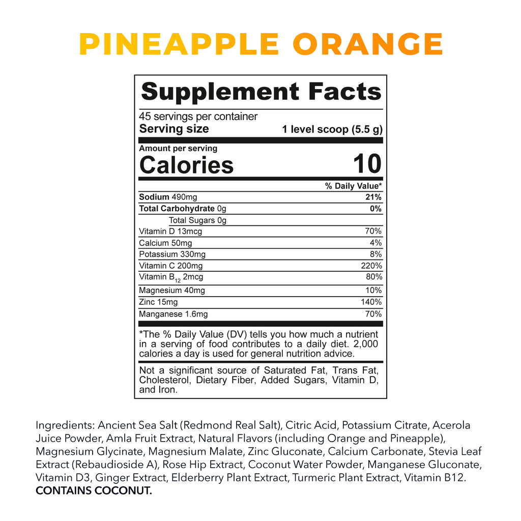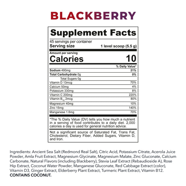 Each serving delivers a blend of vitamins C, D, and  B12, zinc, ginger root, turmeric, elderberry, and electrolytes from our signature Re-Lyte Hydration Mix. Just add it to water for an easy keto, paleo, and vegan friendly way to fortify your immune system and feel like your best self.