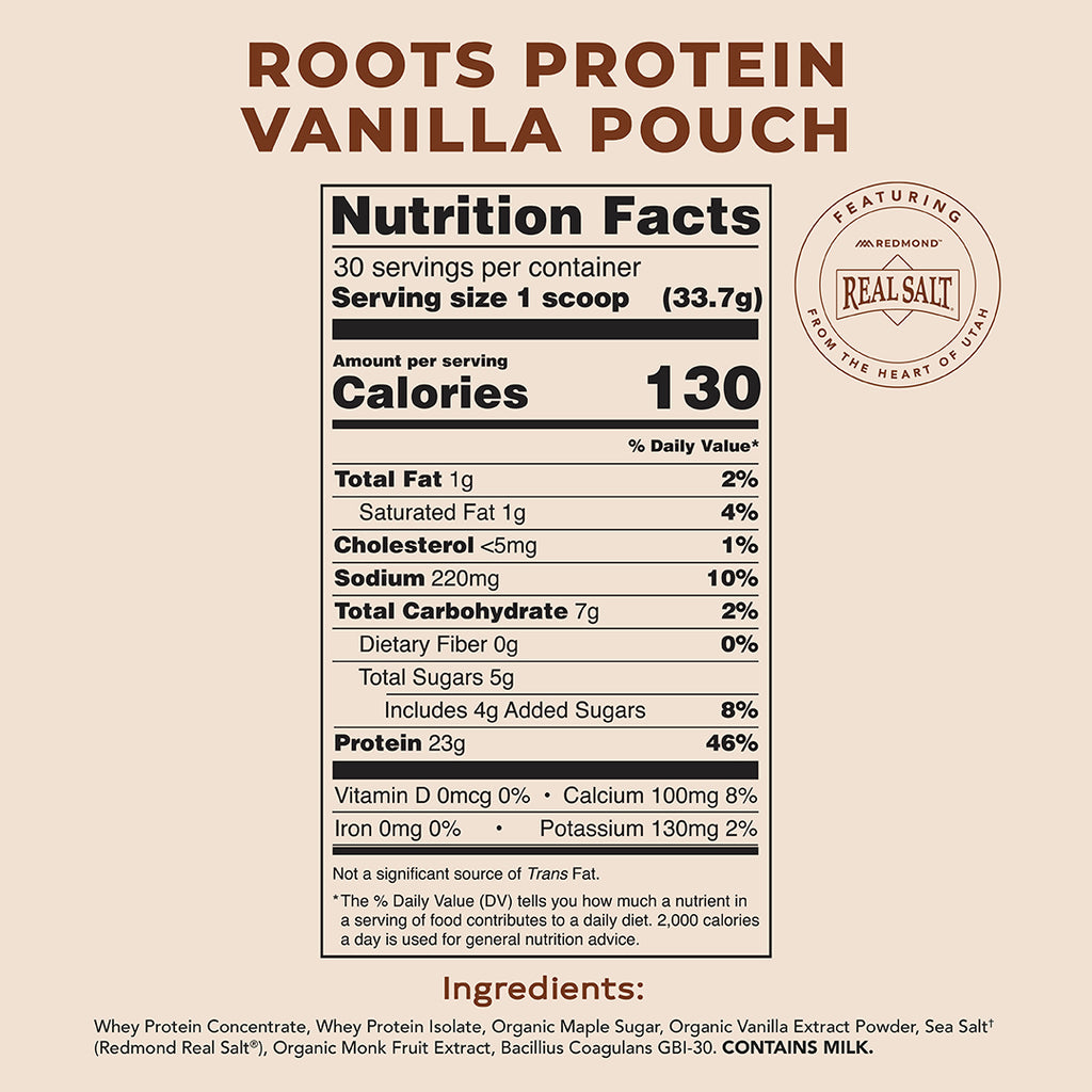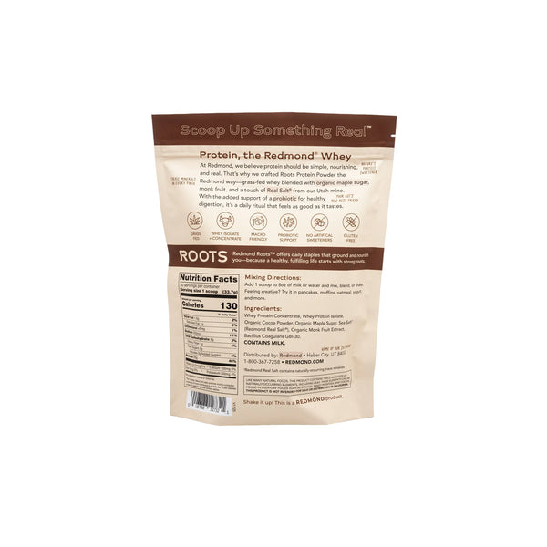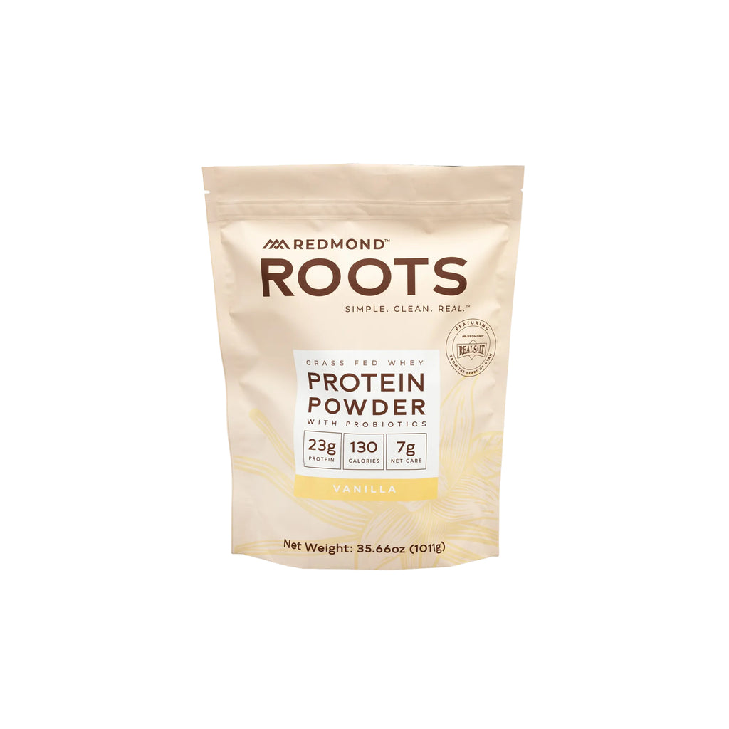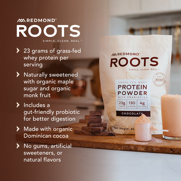 Redmond Roots Protein Powder is a clean, great-tasting protein made with 100% grass-fed whey. Each serving contains 23 grams of protein to support energy, muscle recovery, and daily wellness. Naturally sweetened with organic maple sugar and monk fruit, it blends smoothly in water or milk. Roots Protein also features a gut-friendly probiotic that supports digestion and protein absorption. Available in Chocolate or Vanilla.